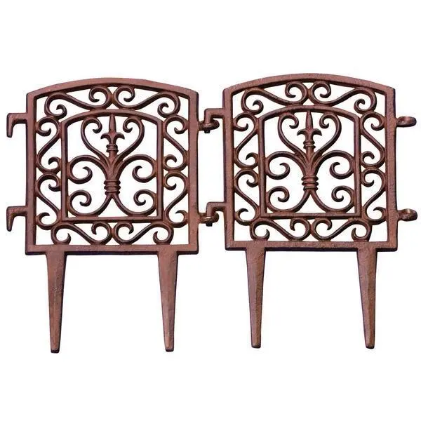 Rustiek bruin gietijzeren klassiek perkhek voor afbakening van kruidentuin en andere bloemenperkjes.