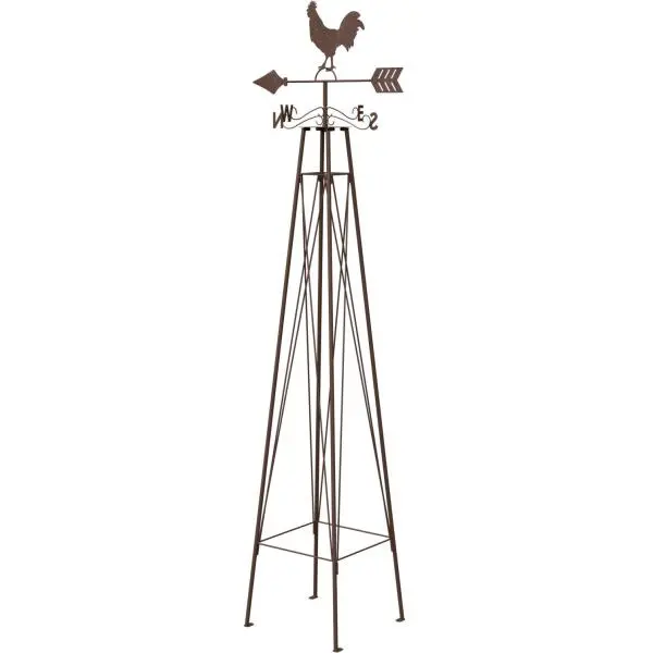 Mooie roest gepoedercoate klimhulp met windhaan voor tuinplanten. Deze obelisk geeft steun aan klimplanten in een border, perk of bloembak.