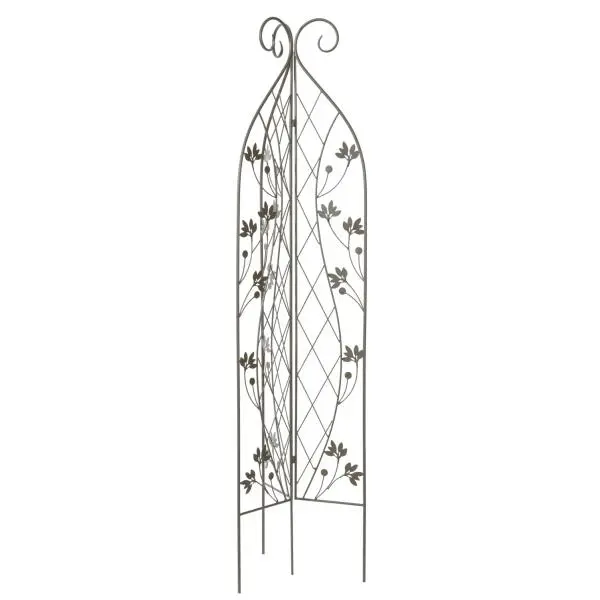 Decoratief metalen rooster met een sierlijk plantenmotief. Kan gebruikt worden als versiering in bloemenborders of als steun voor het omhoog begeleiden van klimplanten. Open de roosters en plaats het hek met de daarvoor voorziene pinnen stevig in de grond.